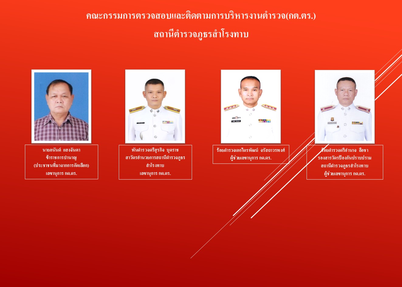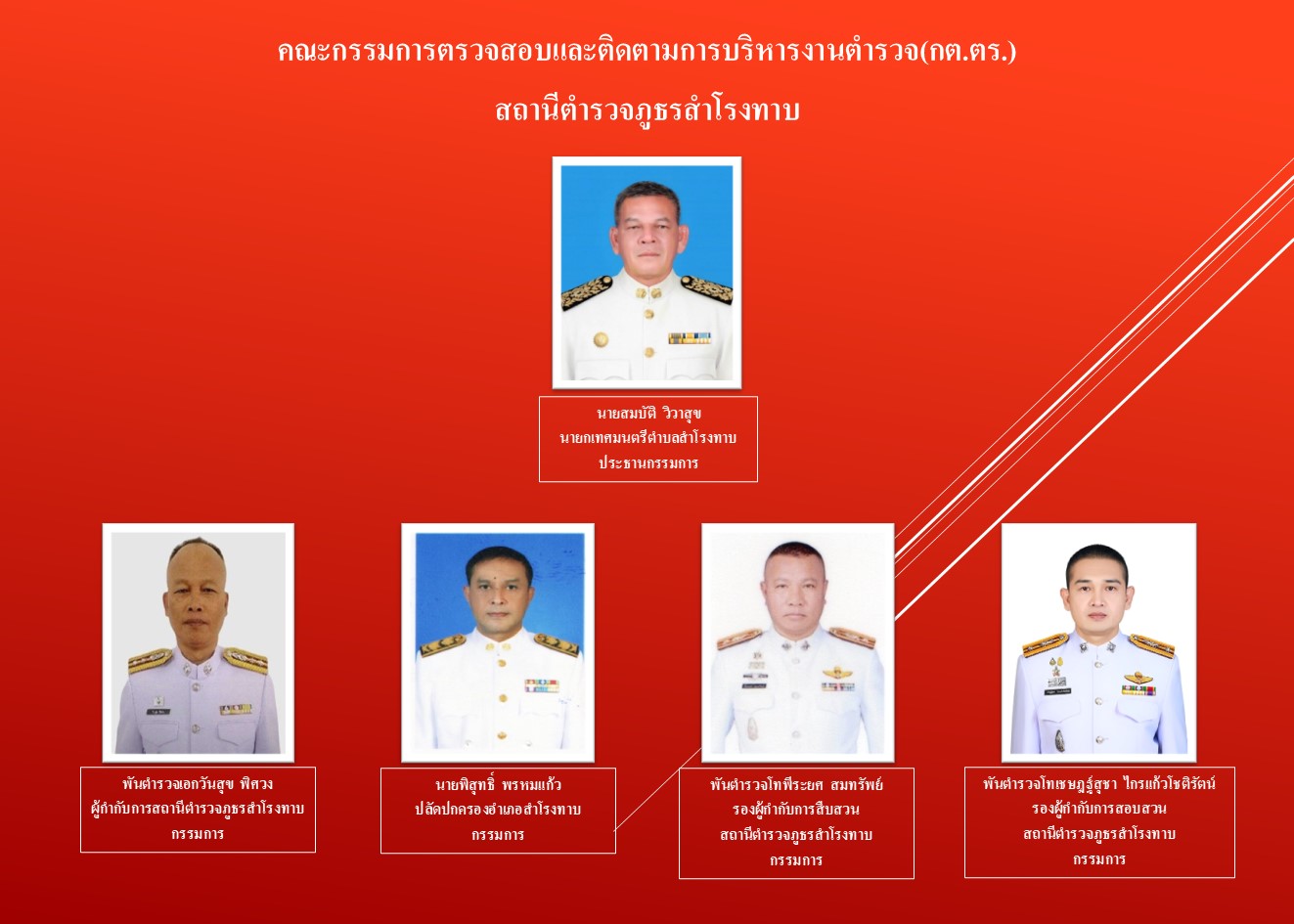 O4. ข้อมูลคณะกรรมการตรวจสอบและติดตามการบริหารงานตำรวจ (กต.ตร.) ของสถานีตำรวจ ระเบียบที่เกี่ยวข้อง ผังโครงสร้างและอำนาจหน้าที่ กต.ตร. คำสั่งแต่งตั้ง กต.ตร.สภ.สำโรงทาบ ลักษณะการมีส่วนร่วมของ กต.ตร. ระเบียบที่เกี่ยวข้อง ระเบียบที่เกี่ยวข้อง ผังโครงสร้างและอำนาจหน้าที่ กต.ตร. คำสั่งแต่งตั้ง กต.ตร.สภ.สำโรงทาบ ลักษณะการมีส่วนร่วมของ กต.ตร. ทำเนียบคณะกรรมการตรวจสอบและติดตามการบริหารงาน ( กต.ตร.)สถานีตำรวจภูธรสำโรงทาบ ข้อมูลเมื่อ 27 มีนาคม 2568 ผลการดำเนินงานของคณะกรรมการติดตามการดำเนินงานของสถานีตำรวจภูธรสำโรงทาบ ***คลิกที่นี่***